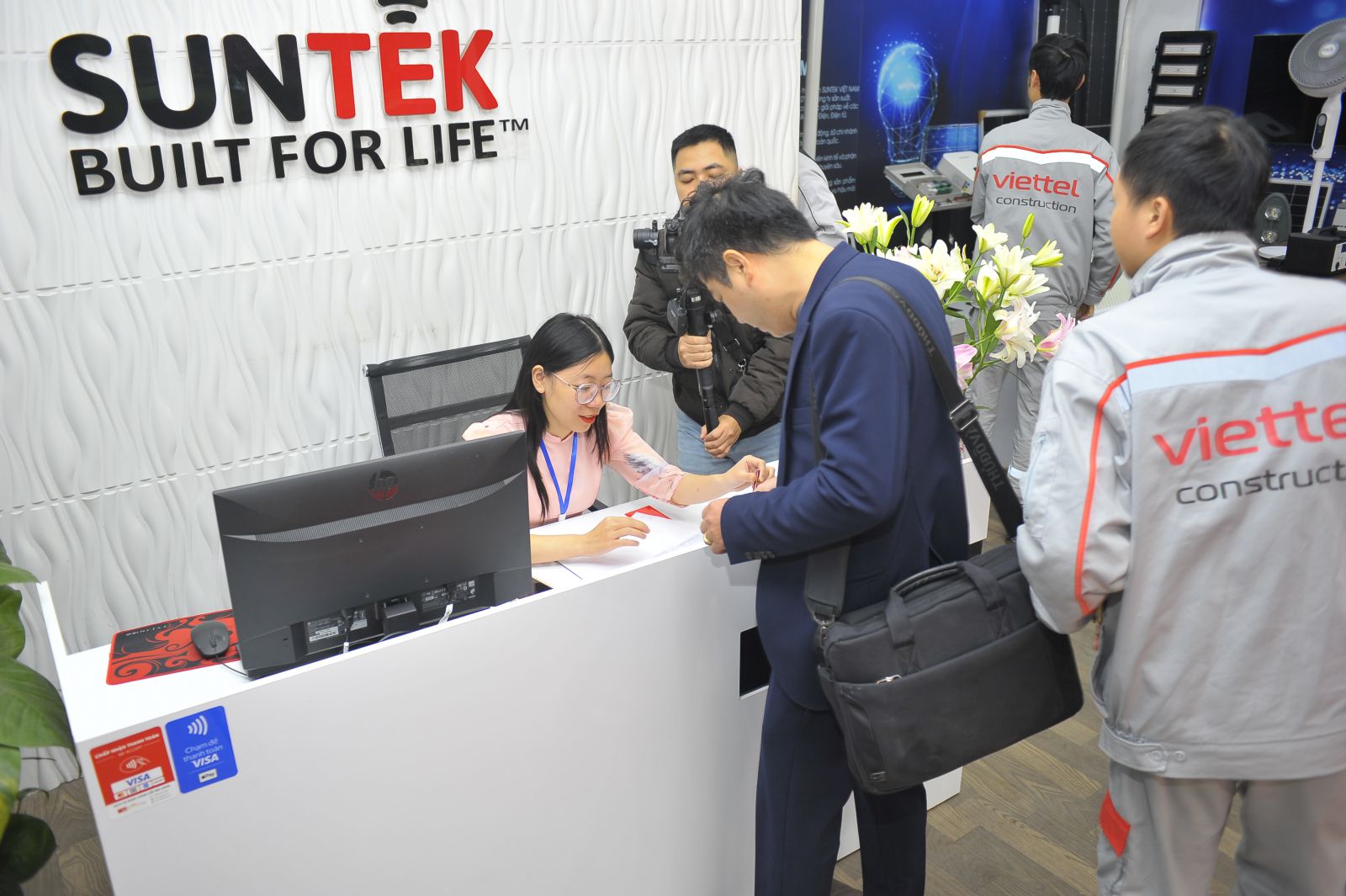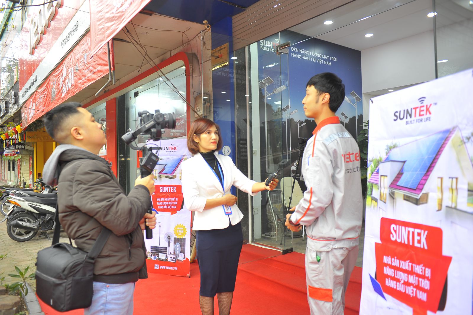 Một cán bộ VIETTEL CONSTRUCTION thực hiện phỏng vấn nhanh trước trụ sở SUNTEK.
