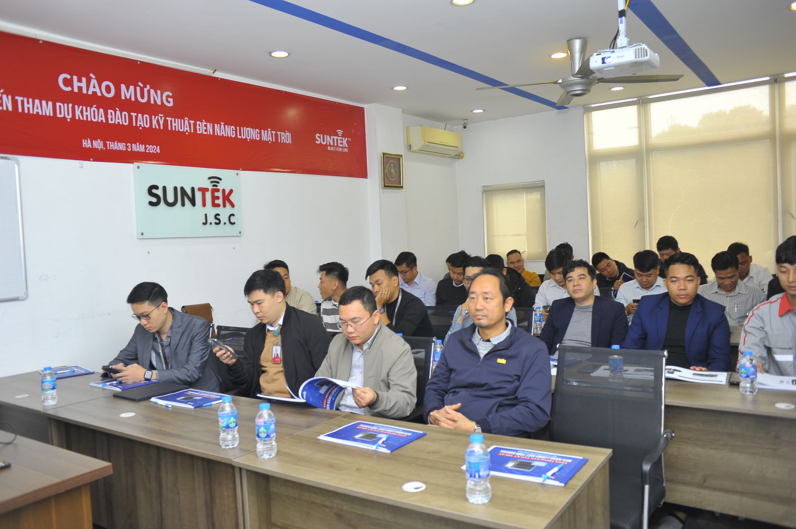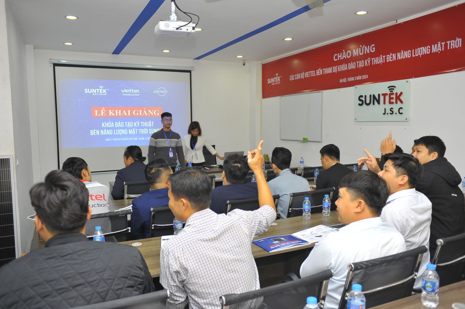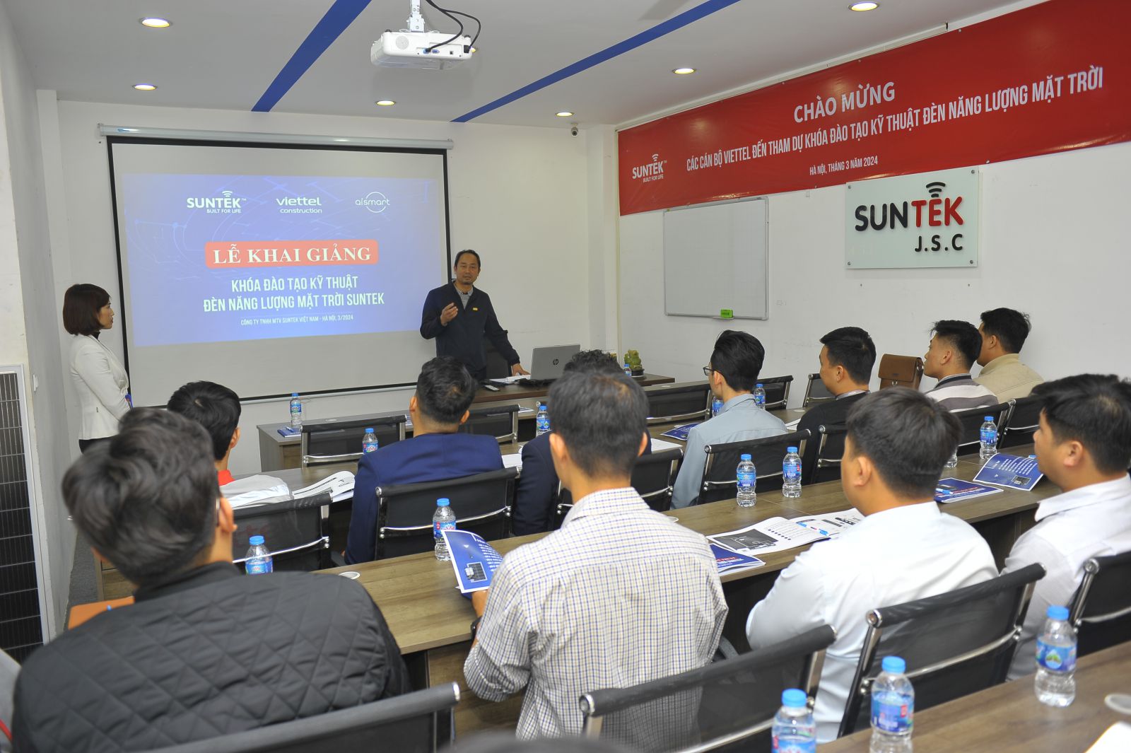 Sáng nay, 11/03/2024 các cán bộ đến từ Công Ty Cổ Phần Công Trình Viettel - VIETTEL CONSTRUCTION đã có mặt tại trụ sở SUNTEK Việt Nam để tham dự buổi đầu tiên trong khóa Đào Tạo Kỹ Thuật về đèn năng lượng mặt trời, được đào tạo bởi những kỹ sư của SUNTEK.