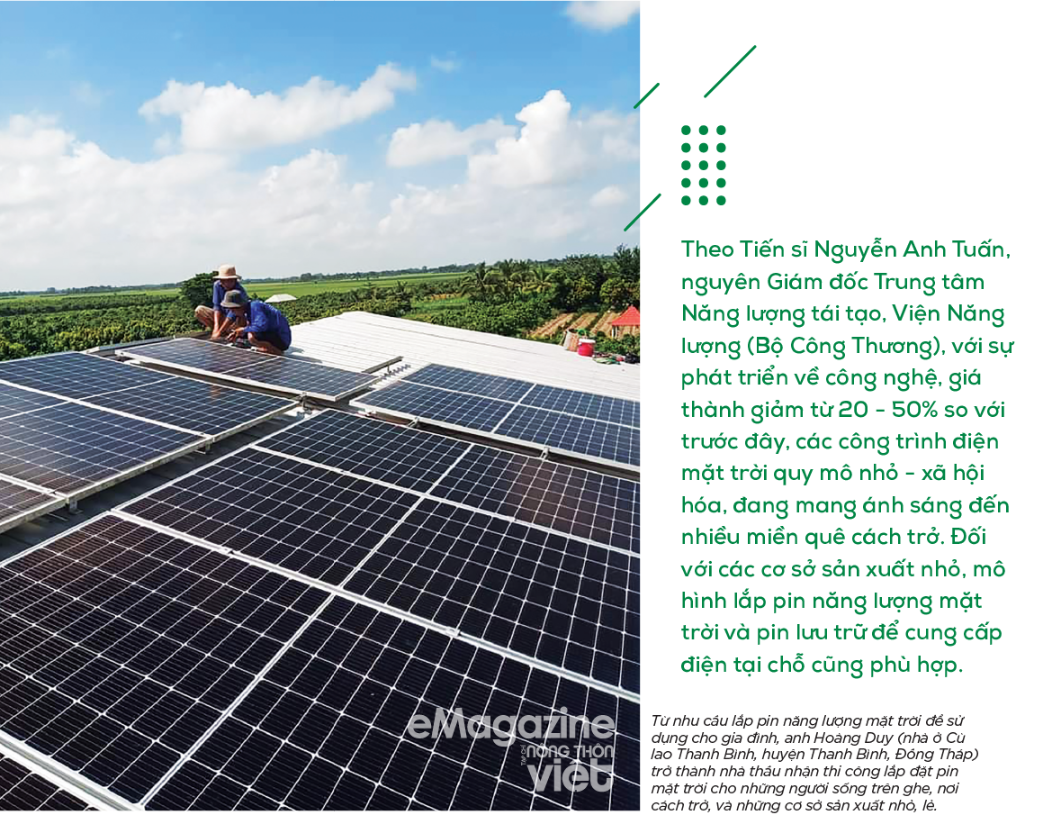 Vườn xoài của anh Quốc ở ấp Trung, xã Tân Quới, huyện Thanh Bình nhiều năm không có điện do đường đi cách trở nên “muốn làm gì cũng khó”. Nhiều lúc anh tính kéo điện từ hệ thống lưới điện về nhưng chi phí quá cao, không kham nổi. Tình cảnh éo le kéo dài nhiều năm. Mới đây, được nhiều người quen giới thiệu, anh Quốc mới liên hệ anh Hoàng Duy để lắp điện mặt trời. “Có điện rồi thì tính dễ lắm!”, anh Quốc hồ hởi nói khi công trình hoàn thành. Với những “ông chủ nhỏ” như anh Quốc, có điện là khởi đầu thuận lợi cho việc đầu tư kinh doanh sản xuất. Đó cũng là lý do mà nhiều chủ trang trại nhỏ ở miền Tây lựa chọn lắp điện mặt trời.