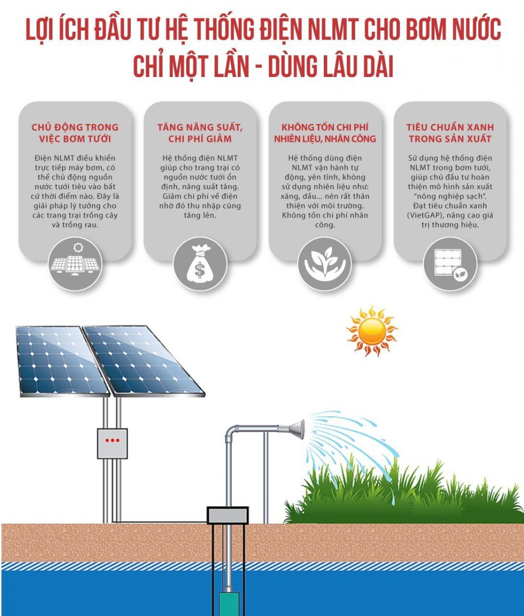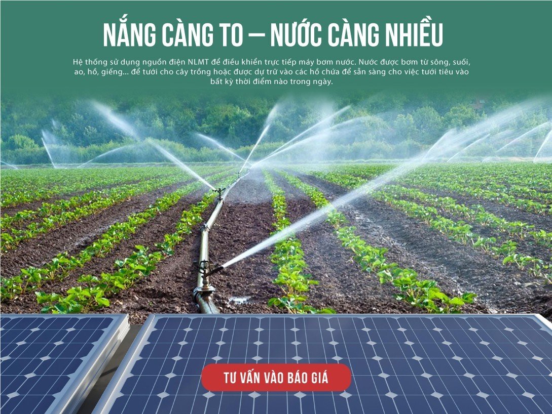 Hệ thống tận dung nguồn Năng Lượng Mặt Trời để giúp cho máy bơm hoạt động. Nước được bơm từ các nguồn nước lớn xung quanh như; Sông, Suối, Ao, Hồ… để tưới cho cây trồng, hoặc bơm vào các hồ dự trữ, hồ chứa để chủ động trong quá trình tươi tiêu của cây trồng.