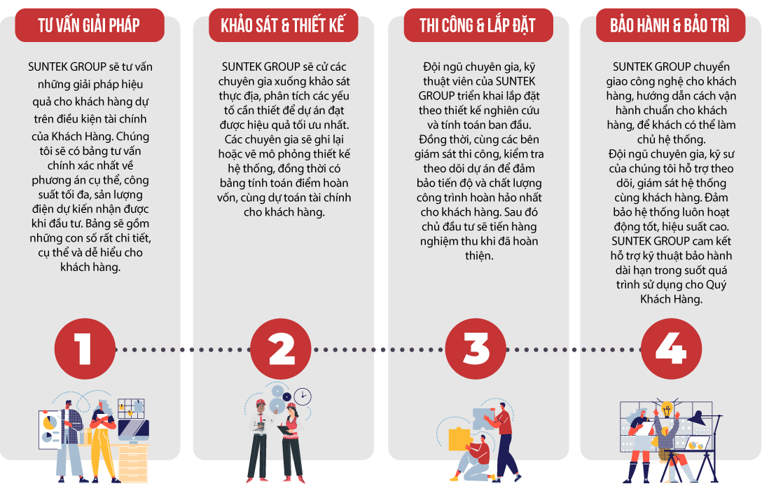 SUNTEK GROUP sẽ cử các chuyên gia xuống khảo sát thực địa, phân tích các yếu tố cần thiết để dự án đạt được hiệu quả tối ưu nhất. Các chuyên gia sẽ ghi lại hoặc vẽ mô phỏng thiết kế hệ thống, đồng thời có bảng tính toán điểm hoàn vốn, cùng dự toán tài chính cho khách hàng.