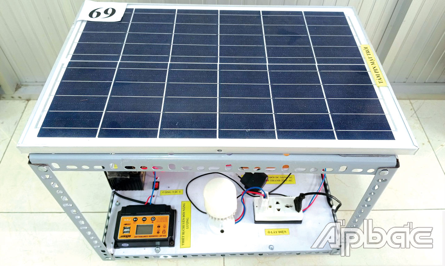Theo đó, sản phẩm dùng tấm pin năng lượng mặt trời 100 W để thu năng lượng ánh sáng và năng lượng này được cấp vào bộ chuyển đổi năng lượng để chuyển từ quang năng thành điện năng. Lượng điện năng sau khi được tạo ra sẽ được nạp vào một bình ắc quy 12 V.