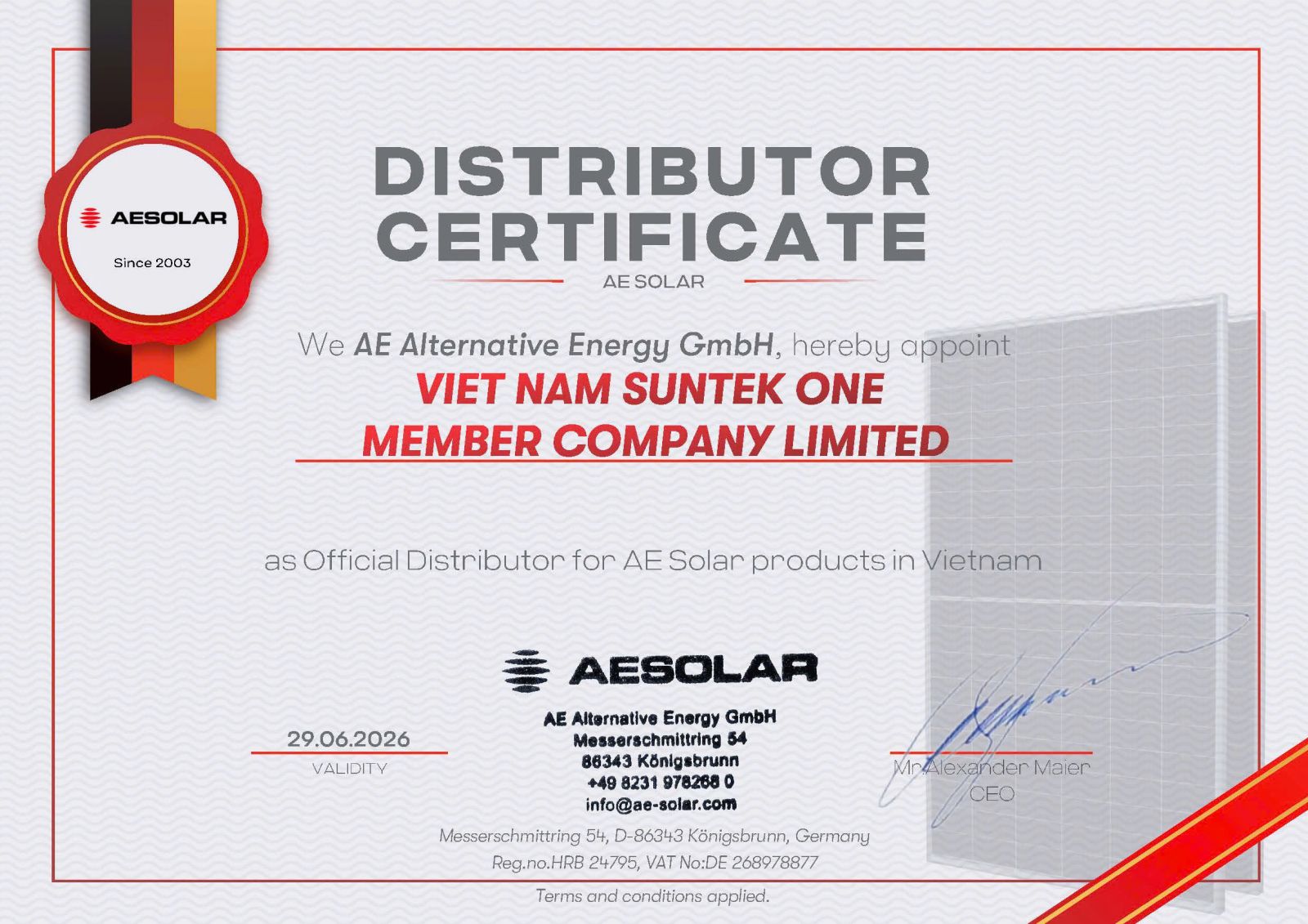 SUNTEK TRỞ THÀNH NHÀ PHÂN PHỐI CHÍNH THỨC PIN NĂNG LƯỢNG MẶT TRỜI AE SOLAR TẠI VIỆT NAM